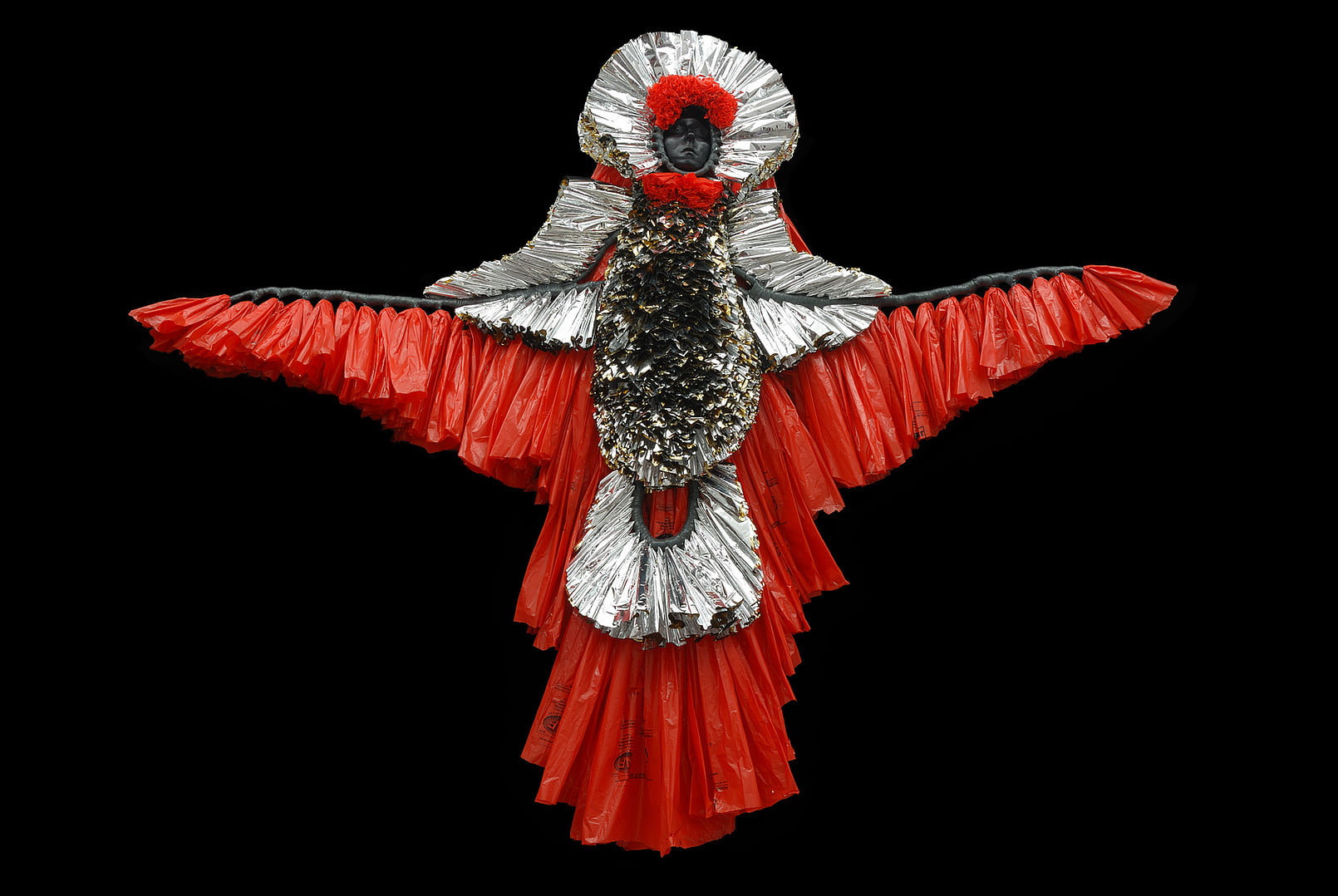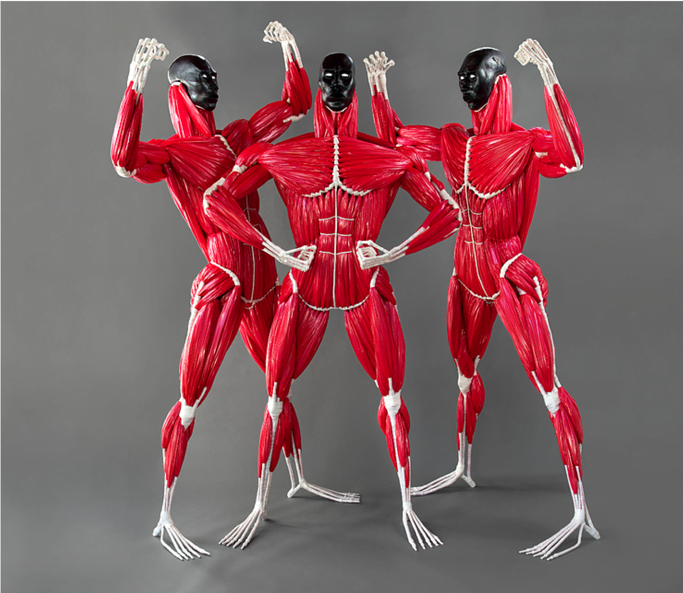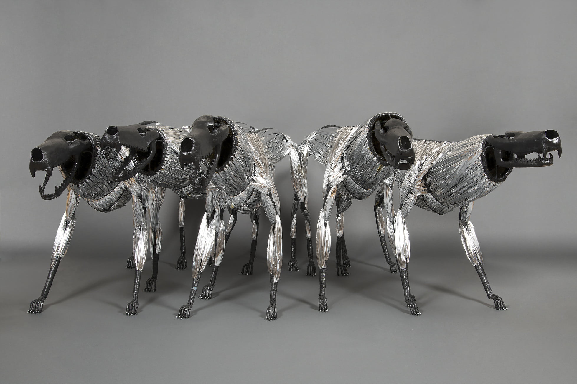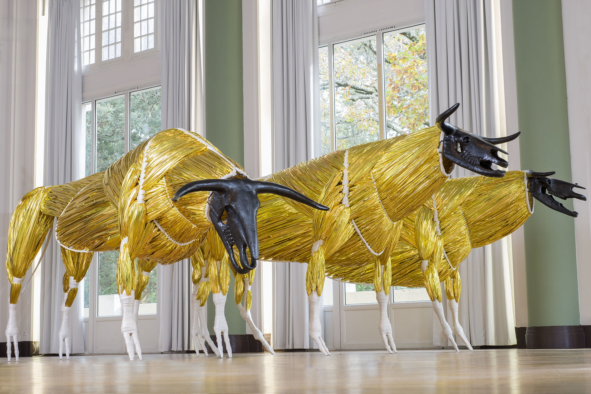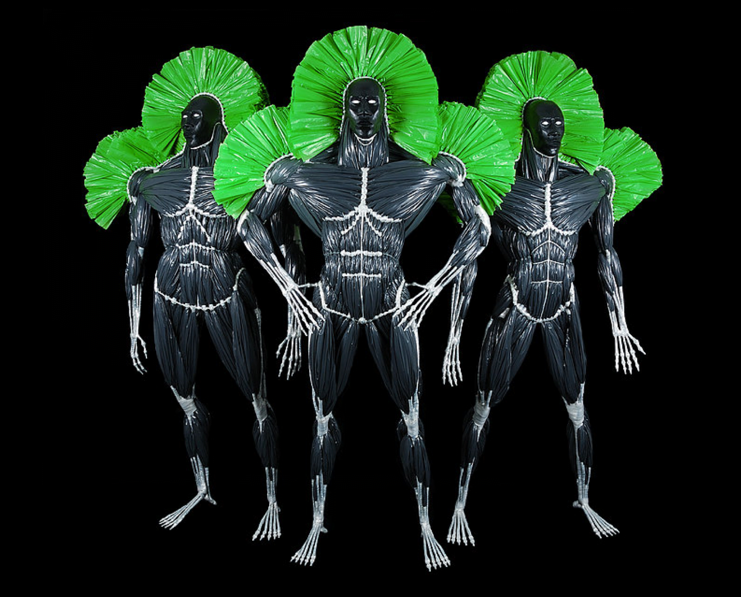 Art d’une guerre contemporaine qui trouve ses racines dans les pratiques ancestrales, le sculpteur se fait sorcier invoquant les esprits de ses dieux noirs, de Martin Luther King à Jimmy Hendrix (“The Solar Fighting Bros”/”The Furious Snakes”). Il puise son inspiration aux origines, alliant guerre et sacré. Les figures de son armée thériomorphe, écorchées dont les plumes se mêlent au filandreux du muscle, évoquent les parures des guerriers Massai ou les costumes de Navajos “Skinwalkers”. La tension anatomique est lisible dans la précision de la structure, elle sublime le matériau profane. Les regards fixent le lointain, nous montrent une autre voie.